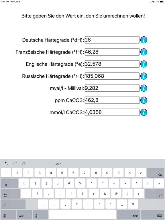 Erleichtern Sie sich die Umrechnung von Wasserhärte-Einheiten mit unserem Wasserhärtekonverter! Die Gesamthärte gibt die Konzentration von Erdalkaliionen, hauptsächlich Calcium- und Magnesiumionen, im Wasser an. Während die korrekte Einheit mmol/L ist, werden oft noch ältere Einheiten verwendet. Unser Konverter bietet Ihnen die Möglichkeit, diese Einheiten präzise umzurechnen und miteinander zu vergleichen. Perfekt für Haushalt, Labor und Industrieanwendungen – schnell, zuverlässig und einfach zu bedienen!