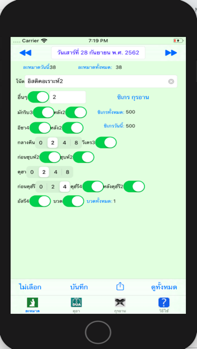 กดปุ่มบันทึก เพื่อบันทึกจำนวนละหมาดในวันนั้นลงในไฟล์ และบันทึกลงปฏิทินของไอโฟน