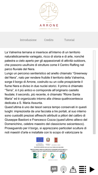 “Arrone – l’armonia in un borgo” è una applicazione che sfrutta le funzioni dell’Augmented Reality e del Bluetooth per dare al turista una esperienza unica e coinvolgente di visita del patrimonio artistico del borgo di Arrone. E’ sufficiente scaricare l’APP dallo store, concedere le autorizzazioni ed accendere il Bluetooth dello smartphone. Durante la vostra visita l’APP rileverà i sensori ibeacon presenti in prossimità dei punti di interesse, che attiveranno automaticamente l’audioguida ed apriranno la scheda descrittiva del monumento. Il visitatore inoltre all’interno della chiesa di San Giovanni Battista potrà sfruttare anche la Realtà Aumentata, puntando la fotocamera del dispositivo su alcuni affreschi: in questo modo sarà possibile osservare ricostruzioni ed informazioni aggiuntive direttamente sui dipinti; successivamente basterà abbassare la fotocamera per accedere automaticamente al contenuto della sua scheda descrittiva ed alla audioguida. Puntando la fotocamera verso un altro affresco sarà possibile effettuare altre esperienze.