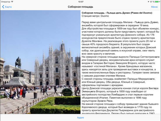 ● АУДИОГИД ПО МИЛАНУ. Рассказы аудиогида озвучены профессиональным диктором на студии звукозаписи. Слушайте рассказы, не отвлекаясь от осмотра достопримечательностей и не теряя время. Не стоит лишний раз портить зрение, читая на ходу текст на небольшом экране.