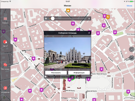 ● ЭКСКУРСИИ ПО МИЛАНУ. Воспользуйтесь предварительно составленными обзорными экскурсионными маршрутами, включив автоматический режим экскурсии. Подробнее о маршрутах на нашем сайте 1000guides.com