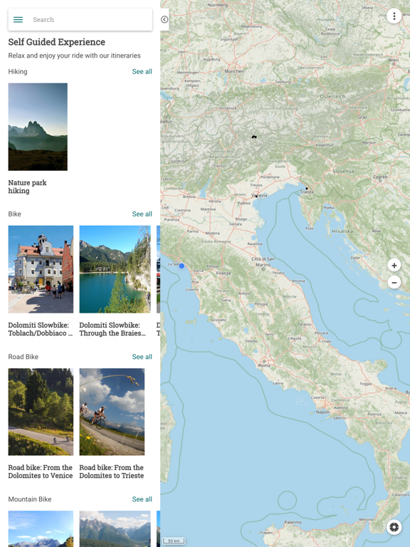 The Dolomiti Slowbike App shows you the route for your trip. The Open Street Map cartography is combined with the routes for hikers and cyclists developed by Dolomiti Slowbike. The routes are structured according to degrees of difficulty and are enriched by interesting information along the route. So you can find out where the bars and restaurants are located, inform yourself about the tourist places.