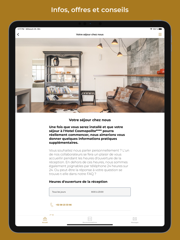 L’application est votre compagnon de voyage idéal – vous y trouverez les informations les plus importantes concernant vos vacances à l’Hotel Cosmopolite en Belgique. Télécharger maintenant !