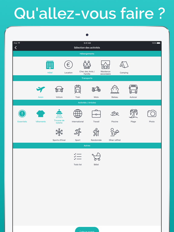 Selon la durée du séjour, de la météo et des activités planifiées, votre checklist de voyage sera prête. Ceci est l'outil parfait pour vos vacances d'été, les week-ends prolongés, les déplacements professionnels, les road trips et même le camping.