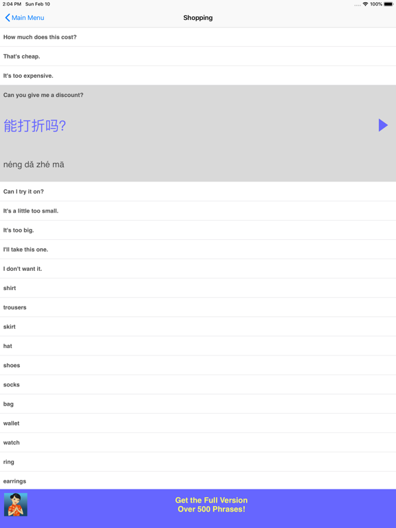 Great for travel or study! Speak Chinese Travel Phrasebook Lite is an easy to use talking phrasebook app for the Chinese language. Each phrase is displayed in large sized Chinese script, phonetic transliteration, and English translation. Hear the audio for each phrase in a clear, pleasant voice from a Chinese native speaker. This free version of the app contains dozens of useful words and phrases in the following categories: