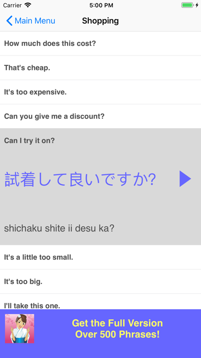 Great for travel or study! Speak Japanese Travel Phrasebook Lite is an easy to use talking phrasebook app for the Japanese language. Each phrase is displayed in large sized Japanese script, phonetic transliteration, and English translation. Hear the audio for each phrase in a clear, pleasant voice from a Japanese native speaker. This free version of the app contains dozens of useful words and phrases in the following categories: