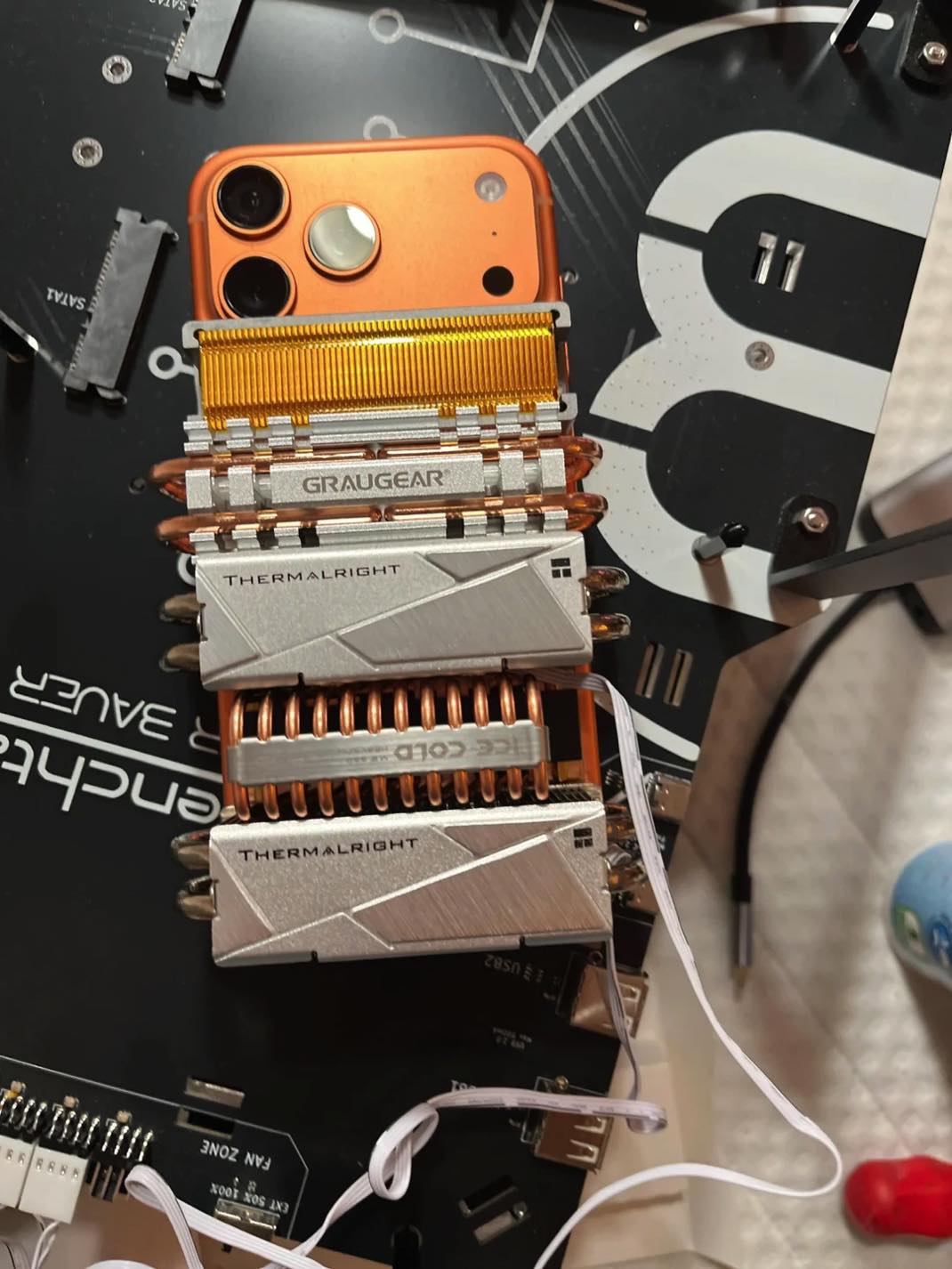 Les iPhone 17 Pro et Pro Max introduisent une nouvelle technologie de refroidissement du SoC, une chambre à vapeur (remplie d’eau) capable de faire baisser la température autour du composant, y compris lorsque le processeur mouline à fond (c’est même le principal intérêt d’un tel système de refroidissement). L’ingénieux T-K-Tronix a trouvé un moyen d’optimiser encore plus l’ensemble en utilisant un composant franchement insolite, soit des dissipateurs de SSD M.2 ! Le bidouilleur a décrit les étapes de son « exploit » sur Reddit.