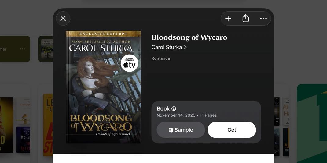 Apple joue le jeu à fond, avec même un long pitch pour décrire l’ouvrage : « Ahoy, lecteurs chanceux… les vents de Wycaro soufflent à nouveau ! L’auteure à succès Carol Sturka offre aux lecteurs un extrait exclusif du quatrième livre nouvellement sorti de sa trilogie de romantasy épique. Ce livre contient un chapitre complet du roman Bloodsong of Wycaro, ainsi qu’une lettre spéciale de Carol. Embarquez avec Lucasia, capitaine du duneship Mercator, tandis qu’elle traverse les sables amarante de Wycaro à la recherche d’un remède pour la maladie insidieuse qui terrasse son équipage. Alors que Lucasia affronte une tempête traîtresse, elle est hantée par les souvenirs de Raban, le voyou qui lui a volé son cœur avant d’être forcé à marcher sur la planche. Bouillonnante de passions qui réclament d’être libérées, elle découvre bientôt que la seule chose pire que de se retrouver seule dans le noir… c’est de découvrir que vous ne l’êtes pas. »