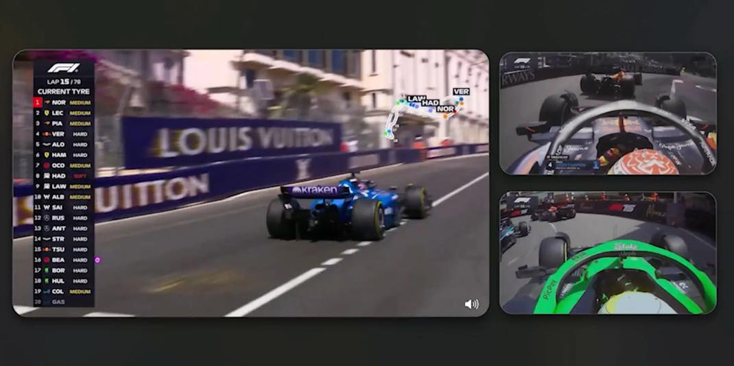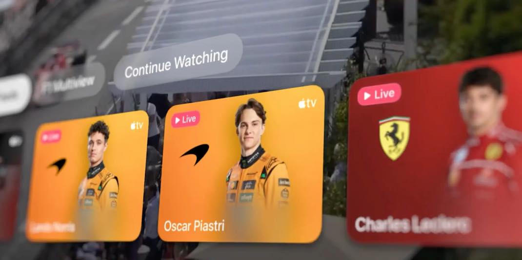 Autre annonce majeure : l’intégration des caméras embarquées des pilotes. Une fonctionnalité particulièrement prisée des passionnés, désormais enrichie par le mode Multiview, permettant d’afficher plusieurs angles en simultané sur l’Apple TV, l’iPad et aussi… l’Apple Vision Pro !