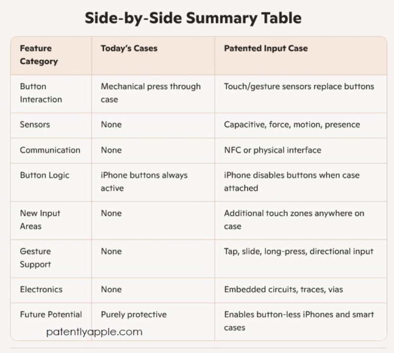 Le brevet décrit une coque équipée de capteurs tactiles capables de détecter des pressions, des tapotements, des glissements ou même un simple contact. Une fois installée, la coque pourrait désactiver totalement les boutons matériels de l’iPhone et rediriger les commandes via ses propres capteurs. « La coque devient la surface d’interaction principale », suggère le document.