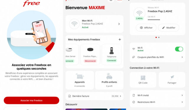L’application Free gagne notamment une section « Mon Wi-Fi » pour accéder aux différents paramètres réseau. Vous pouvez afficher le mot de passe du Wi-Fi, désactiver le réseau sans fil, faciliter la connexion avec un QR Code, mettre en place des restrictions et plus encore. Il y a également la centralisation des équipements, que ce soit l’état de la Freebox, des répéteurs Wi-Fi, du téléphone et plus. Une autre fonctionnalité est la gestion des profils pour le contrôle parental, les horaires d’accès et d’autres éléments.
