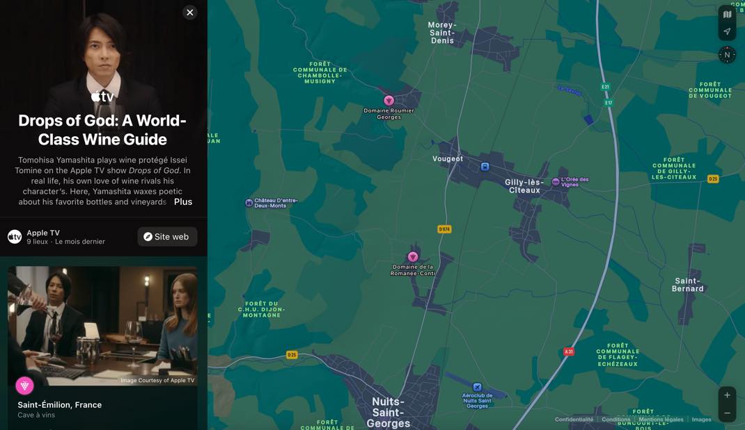 Chaque domaine bénéficie d’une fiche détaillée intégrée à Plans, avec photos, informations pratiques et options de partage pour organiser facilement une visite. Le guide propose également un lien vers la bande originale de la série sur Apple Music, renforçant l’expérience entre fiction, musique et découverte géographique.