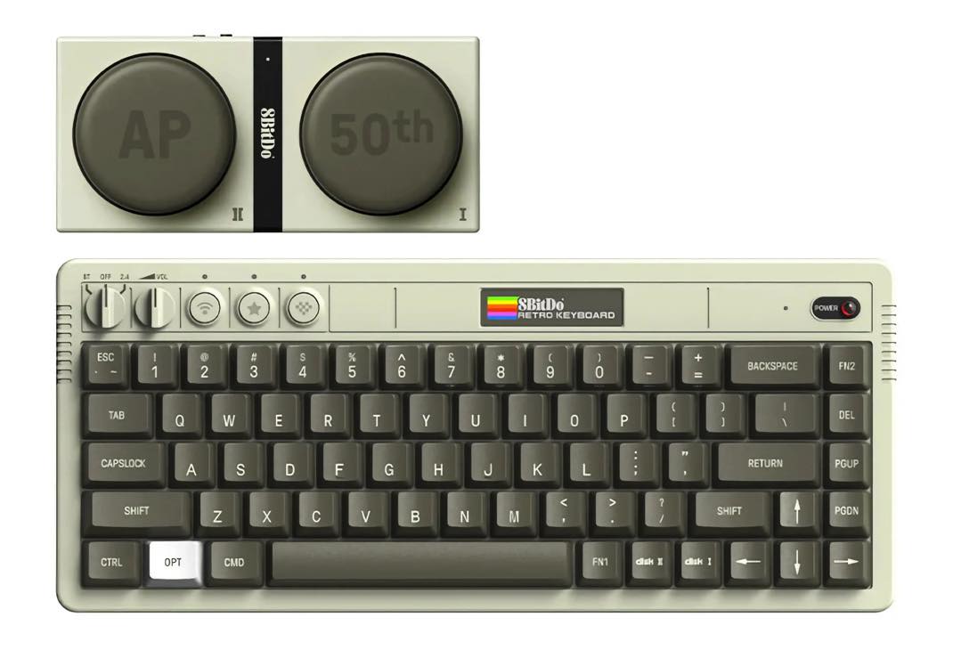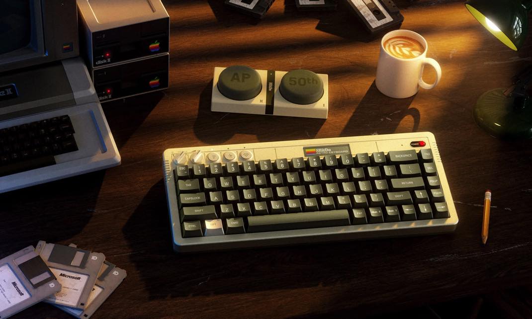 8BitDo n’a pas besoin d’apposer un logo Apple pour que la référence saute aux yeux. Le clavier joue clairement la carte de l’évocation : couleurs d’époque, typographie inspirée des anciens marquages, touches thématiques et silhouette immédiatement reconnaissable pour quiconque a déjà croisé un Apple II. Ces hommage sans licence directe sont devenus la marque de fabrique de l’accessoiriste, à qui l’on doit déjà des claviers inspirés du Commodore 64, de la NES ou bien encore des machines IBM.