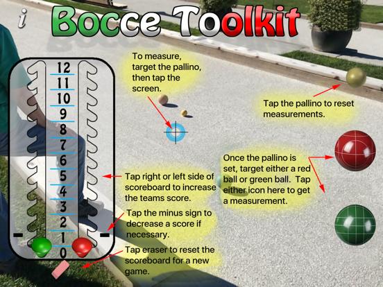 In addition you can use the Bocce Toolkit to keep score by moving markers up the screen to show the number of points that each team has.