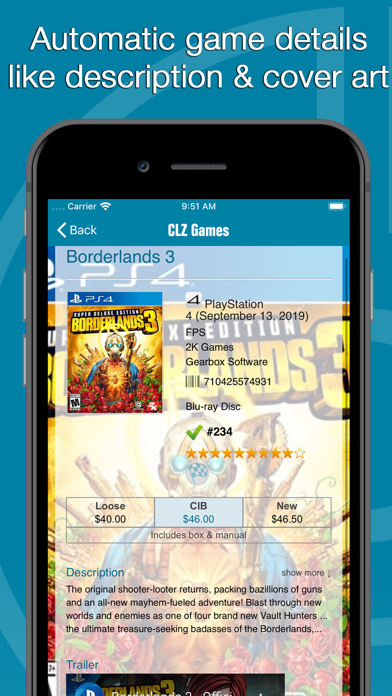 Notre base de données de jeux vidéo en ligne CLZ Core fournit automatiquement les jaquettes et tous les détails des jeux dont vous avez besoin, comme les dates de sortie, les éditeurs, les développeurs, les descriptions, les vidéos de bandes-annonces, etc... y compris les prix automatiques des jeux de PriceCharting (mis à jour quotidiennement !).