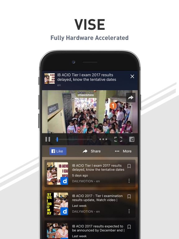 Vise is an essential application for searching, discovering popular video on the internet and major video sites such as YouTube, Vimeo, DallyMotion... Just type your search keyword and the result will be aggregated in single screen.