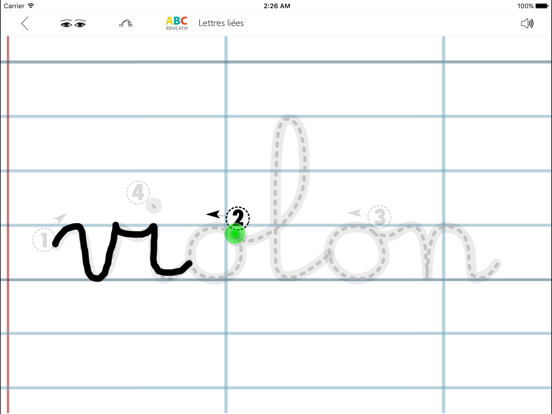 "ABC Lettres Liées" lui propose d'aller plus loin vers la continuité et la fluidité du geste graphique, en abordant les différentes liaisons de lettres cursives. L'application montre le bon geste, à quel moment lever ou baisser le doigt, le sens d'écriture, et vérifie que le tracé de l'enfant est conforme à ce qui lui est montré.
