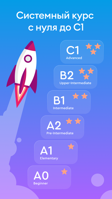 Данный авторский курс английского языка состоит из 6 уровней, где представлены уроки английского языка с нуля до продвинутого уровня (A0 - C1). Данные уровни английского языка в приложении соответствуют международной шкале: