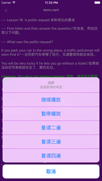 1. 复读功能全面,分为继续播放、暂停播放、复读二遍、复读三遍、复读四遍