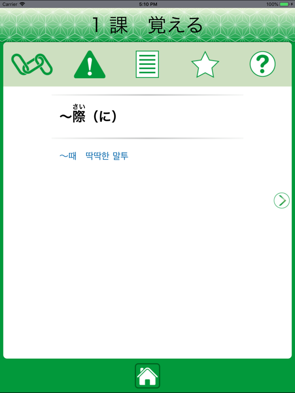 「リスト」:文法形式を五十音順、課順、お気に入りで並べ替えて、学習したい文法形式を選ぶことができます。