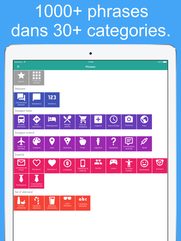 22 Catégories dans la version Pro. Apprenez tous les 1000+ phrases et mots allemande dans la version Pro avec les catégories supplémentaires suivantes :