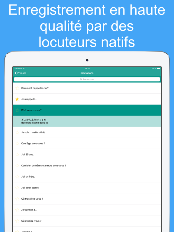 Tous les mots et phrases japonais vous sont présentés en phonétique et en écriture japonaise. Ils sont enregistré par une femme orginaire de Japon.