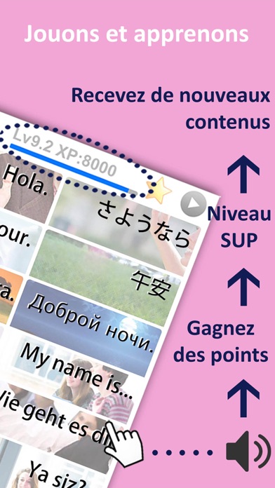 “C'est la plus belle application pour apprendre des langues” “J'aime les belles images de cette application” “C’est amusant d'apprendre une langue avec cette application” “Merci pour cette application de haute qualité avec un bon contenu” “Quoi? C'est gratuit!” --- Expérience d'apprentissage amusante et relaxante --- Regardez de belles cartes, écoutez la prononciation (par des natifs de la langue) et essayez de parler! Avec cette application, vous pourrez apprendre le vocabulaire rapidement et de manière agréable! 3 modes: ・Le Mode Carte: Apprenez à l’aide de jolies photos ・Le Mode Présentation: Donne un aperçu rapide de toutes les cartes ・Le Mode Aléatoire: Vous aide à mémoriser et à contrôler votre apprentissage --- Apprendre de 50 langues traduites par des locuteurs natifs --- français, anglais, espagnol, allemand, italien, russe, japonais, chinois traditionnel, chinois simplifié (mandarin), cantonais , portugais, coréen, néerlandais, suédois, polonais, turc…etc.Nous vivons à l'étranger et nous aimons apprendre de nouvelles langues et cultures. Nous sommes expérimentés dans l'enseignement des langues aux étrangers et aux enfants. Cette application adopte notre expérience de l'enseignement ainsi que des méthodes scientifiques pour augmenter votre intérêt à l’apprentissage, de manière efficace. Les voix sont prononcées par des locuteurs natifs, et la grammaire est précise. --- absolument GRATUIT --- Jouez aux cartes, obtenez des points d'expérience, montez de niveau et gagnez de nouvelles cartes gratuitement! Apprendre est devenu amusant ! Plus de 30 catégories comprenant: ・Conversations de base, salutations ・Les chiffres, les couleurs, les animaux ・Le restaurant, la nourriture, les légumes, les fruits ・Les voyages, les transports, les courses, L'hôtel (nouveau contenu) ・La date, les directions, le temps, la famille, le corps (nouveau contenu) ・les occupations, les passe-temps et plus (à venir)