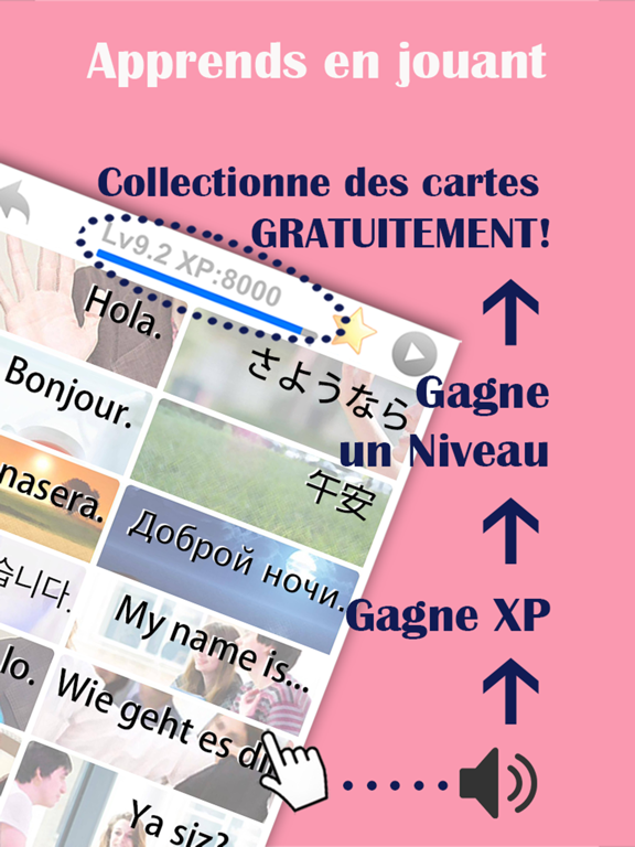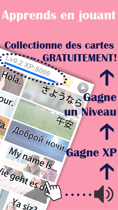 “C'est la plus belle application pour apprendre des langues” “J'aime les belles images de cette application” “C’est amusant d'apprendre une langue avec cette application” “Merci pour cette application de haute qualité avec un bon contenu” “Quoi? C'est gratuit!” --- Expérience d'apprentissage amusante et relaxante --- Regardez de belles cartes, écoutez la prononciation (par des natifs de la langue) et essayez de parler! Avec cette application, vous pourrez apprendre le vocabulaire rapidement et de manière agréable! 3 modes: ・Le Mode Carte: Apprenez à l’aide de jolies photos ・Le Mode Présentation: Donne un aperçu rapide de toutes les cartes ・Le Mode Aléatoire: Vous aide à mémoriser et à contrôler votre apprentissage --- Apprendre de 50 langues traduites par des locuteurs natifs --- français, anglais, espagnol, allemand, italien, russe, japonais, chinois traditionnel, chinois simplifié (mandarin), cantonais , portugais, coréen, néerlandais, suédois, polonais, turc…etc.Nous vivons à l'étranger et nous aimons apprendre de nouvelles langues et cultures. Nous sommes expérimentés dans l'enseignement des langues aux étrangers et aux enfants. Cette application adopte notre expérience de l'enseignement ainsi que des méthodes scientifiques pour augmenter votre intérêt à l’apprentissage, de manière efficace. Les voix sont prononcées par des locuteurs natifs, et la grammaire est précise. --- absolument GRATUIT --- Jouez aux cartes, obtenez des points d'expérience, montez de niveau et gagnez de nouvelles cartes gratuitement! Apprendre est devenu amusant ! Plus de 30 catégories comprenant: ・Conversations de base, salutations ・Les chiffres, les couleurs, les animaux ・Le restaurant, la nourriture, les légumes, les fruits ・Les voyages, les transports, les courses, L'hôtel (nouveau contenu) ・La date, les directions, le temps, la famille, le corps (nouveau contenu) ・les occupations, les passe-temps et plus (à venir)