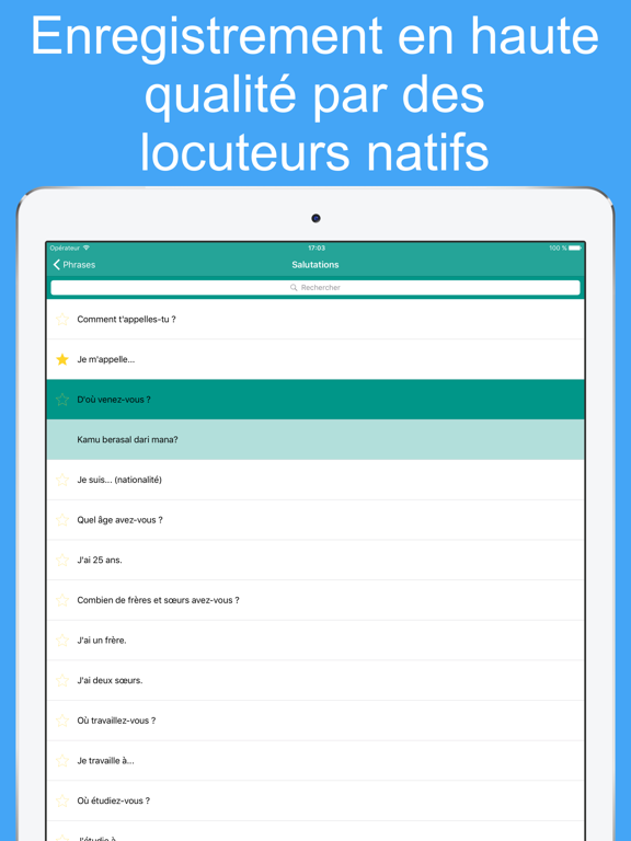 Tous les mots et phrases indonésien vous sont présentés en phonétique et en écriture indonésienne. Ils sont enregistré par une femme orginaire de Indonésie.