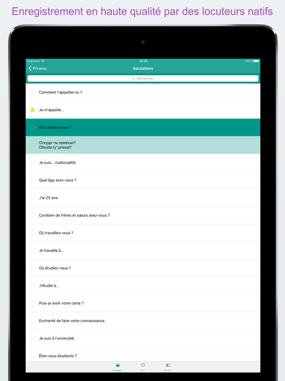 Tous les mots et phrases russe vous sont présentés en phonétique et en écriture russe. Ils sont enregistré par une femme orginaire de Russie.