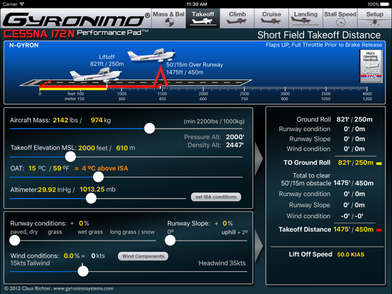 Calculates Ground Roll and Landing Distance based on wind, elevation, altimeter setting etc.