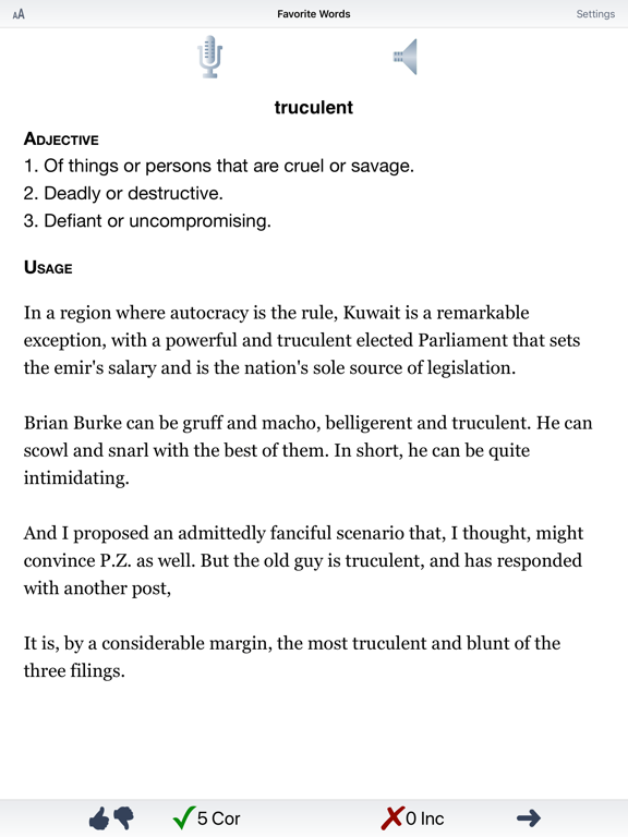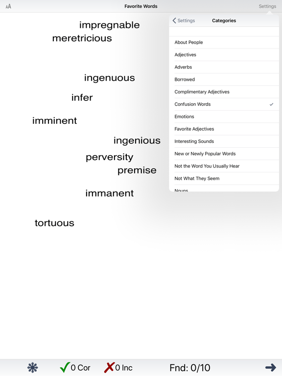 This app has two modes. The first mode is a learning mode where the student becomes familiar with the words and their definitions. The second mode is a practice mode where the student views a definition, then picks the word out of a field of ten words. The student plays until all 10 words are identified.