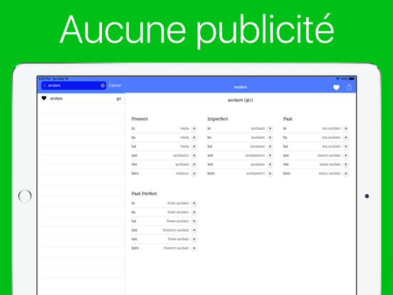 Maintenant, avec l'audio! Vous ne savez pas comment prononcer un verbe? Vous pouvez maintenant écouter la prononciation de chaque verbe. Il suffit de taper sur le bouton à côté de la conjugaison. Remarque: cette fonctionnalité nécessite une connexion Internet.