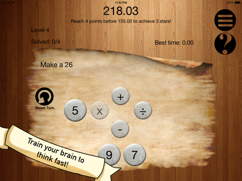 Number King promotes agile mathematical reasoning as you attempt to solve each multi-step puzzle as quickly as you can. Each puzzle contains a target number, a set of source numbers, and a choice of operators. Use all the source numbers and +, -, x, or ÷ to make the target number. Off to the wrong start? Reset the puzzle and try again. Number King times you as you tap through the equations, rewarding you for fast thinking.