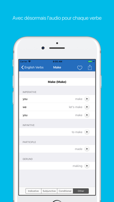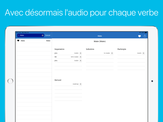 Maintenant, avec l'audio! Vous ne savez pas comment prononcer un verbe? Vous pouvez maintenant écouter la prononciation de chaque verbe. Il suffit de taper sur le bouton à côté de la conjugaison.