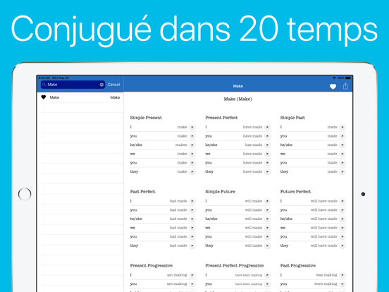 Consulter pratiquement 2000 verbes Anglais dans 20 temps. Avec une navigation simple et un outil de recherche intégré, vous pouvez trouver le verbe dont vous avez besoin en quelques secondes.