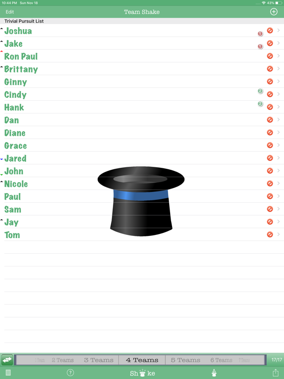 Team Shake is the premier iOS App for creating teams. Instead of a hat and scraps of paper, the user enters his friends' names in his iPhone and gives it a shake. The screen will then display a random set of color-coded teams. These teams can immediately be used for game play or shared via facebook or email. The quick and easy selection of random (or balanced) teams eliminates fighting over who will be on which team. Innovative use of the iPhone shake gesture gives users the satisfying feeling of shaking a virtual hat without the trouble of carrying around an actual hat. Conventional buttons can also be used for those who would rather not shake their expensive hardware about.