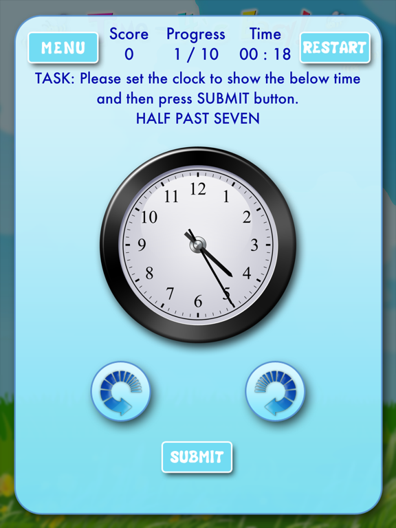 * Reading / telling time in words and setting the traditional analog clock by moving the hour and minute hands, and listening to the time