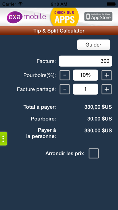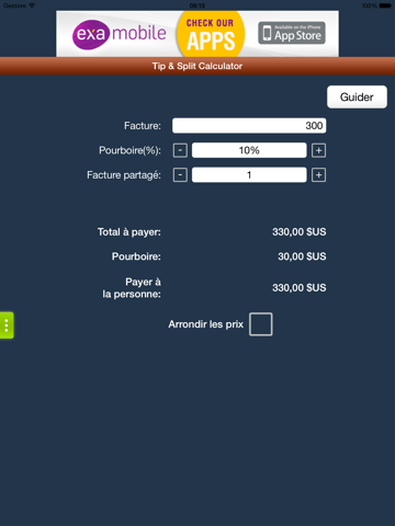 Un calculateur de pourboire qui est simple et facile à utiliser. Vous allez adorer les grandes, faciles à voir Boutons et numéros. Vous pouvez calculer rapidement la pointe et de diviser le projet de loi avec peu d'effort.