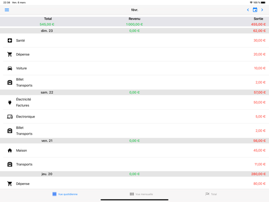 Gardez une trace des dépenses que vous passez au jour le jour et les vérifier très facilement. Avec « Mes dépenses pro » vous pouvez facilement mémoriser tous les mouvements liés à votre épargne et les regrouper dans des intervalles de temps, gestion des catégories liées aux revenus et aux dépenses d'une manière personnalisée. En outre, vous pouvez afficher des graphiques et des statistiques, définir un budget mensuel et exporter la base de données des transactions. Tout cela dans un graphique intuitive et agréable.