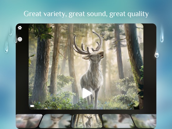 Rainy features a great variety of amazingly polished rain audio scenes. Each scene comes with a 3D motion-controlled parallax illustration with real rain recorded in psychoacoustic 3D for headphones.