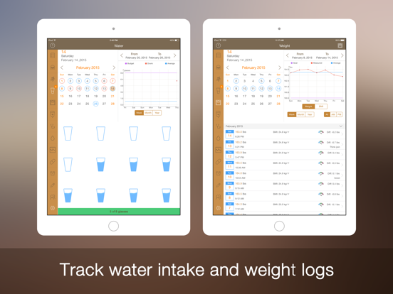 ⁃ Show your target, actual and average glasses of water intake by chart.