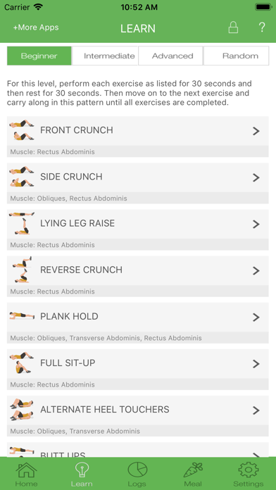 The App has many Ab Exercises for the Beginner, Intermediate & Advanced users. Exercise illustrations, description and videos are also included along with professionally recorded voice-overs.