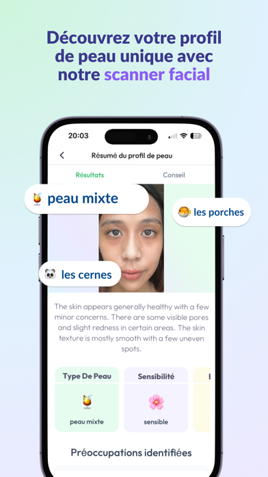 Scanne ton visage, détecte les problèmes visibles et crée un profil personnalisé : type de peau, préoccupations et objectifs.