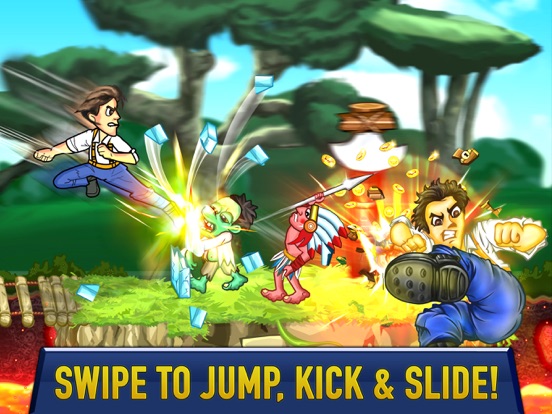 Action Heroes is a fast-paced, action-packed endless running game that lets you knock through zombie enemies at breakneck speed! Pick from three unique heroes and let the endless running begin, compete with guillotines, spikes, glass walls and shambling zombies all trying to end your game. Use acrobatic jumping and sliding skills to avoid traps, then break out a kick or two when something smashable comes along. Don't forget your jump kick, an exclusive attack not available in other running games!