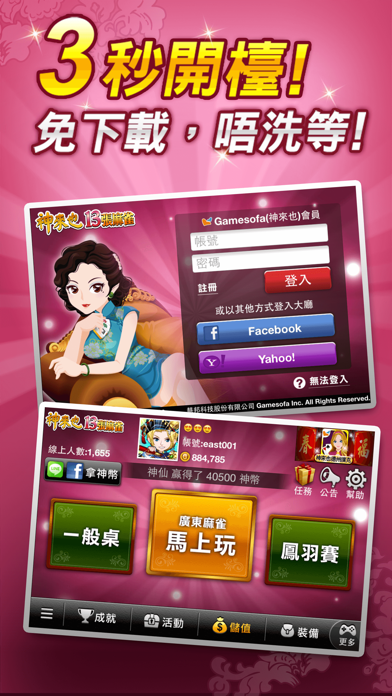 。 原「神來也會員」或「Facebook」、「Yahoo」帳號直接玩