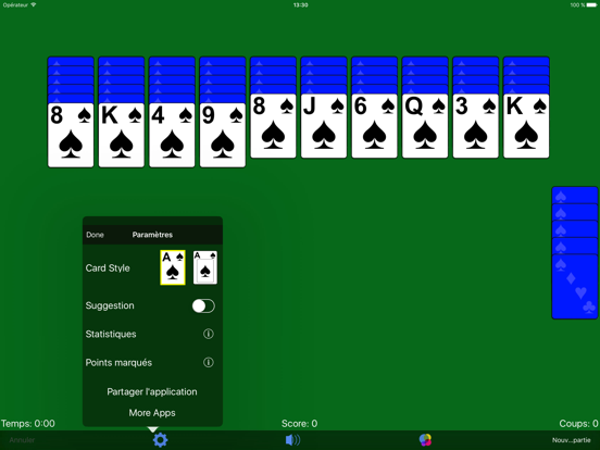 Dans une partie de Spider Patience au niveau basique, vous utilisez 2 decks contenant uniquement des cartes de même couleur. Pour gagner, vous devez retirer des cartes du tableau pour les classer dans l'ordre décroissant, de Roi à As. Si aucun coup n'est disponible, une carte est ajoutée face visible sur chacune des 10 piles du tableau. Spider Patience est un jeu simple lorsque vous jouez avec une seule couleur... mais avec deux ou même quatre couleurs, le défi est autrement plus corsé.