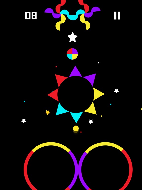 Tapez sur l'écran pour que la balle rebondisse de plus en plus haut. La balle a une couleur et peut traverser un obstacle de la même couleur ou se faufiler entre des obstacles de couleurs différentes.