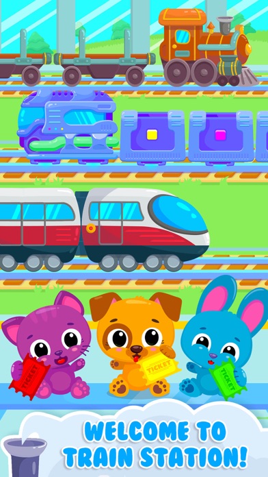 Welcome to Cute & Tiny Train Station for kids! Explore the sweet world of tiny kitty Sue, puppy Bu, bunny Blu and their animal friends! Build, fix, paint, match colors and shapes and help the baby pets while travelling! Become the best driver in Cute & Tiny Trains - a new train simulator and intuitive role playing game for toddler boys and girls! Choo choo! All aboard!