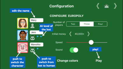 You can play Europoly with other bots or with humans in the same device. We have carefully crafted the Artificial Intelligence of the bots, offering 3 different and engaging levels. In the highest level, they play aggressively and are tough traders. In the intermediate level they are more relaxed and will offer better deals. In the basic level, the bots are soft and you can trick them to get good deals for your interests.
